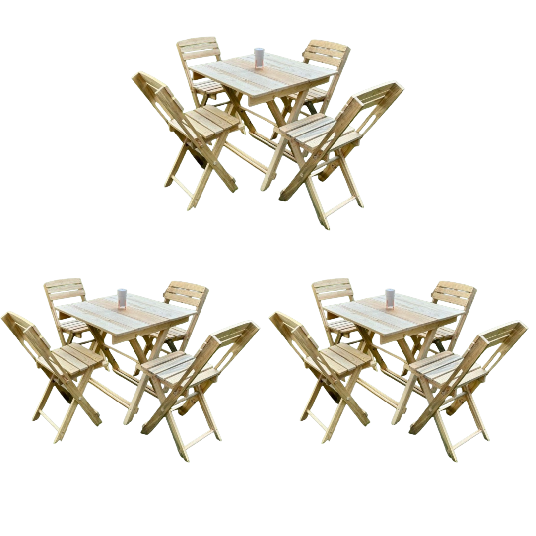 - Madera de pino natural: Fabricado con madera de pino seleccionada, este juego de mesa y sillas ofrece una estética cálida, minimalista y versátil, perfecta para interiores y exteriores techados.